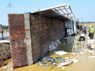 Xe chở hàng chục tấn đá lật nhào xuống ruộng