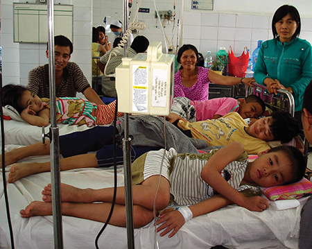 Bộ trưởng Bộ Y tế Nguyễn Thị Kim Tiến (thứ ba từ trái sang) thăm một bệnh nhi mắc bệnh tay chân miệng tại Bệnh viện Nhi Đồng 1 – Ảnh: Minh Đức