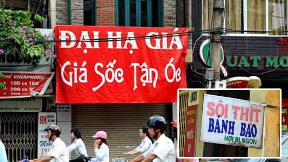 Đó là chuyện của những cửa hàng lớn. C̣n rất nhiều các cửa hàng nhỏ khác, có cách quảng cáo “choáng váng” kiểu như “Bún chả Sinh Từ chính hiệu lâu năm” kèm theo dưới là ḍng chữ “Lưu ư: Cửa hàng kế bên mới mở”. Hay như “Đại hạ giá. Giá sốc tận óc”; “Hàng nhập khẩu từ Mỹ, giá Việt Nam” … Không chỉ gây “sốc tận óc” cho người qua đường đọc phải, rất nhiều biển hiệu quảng cáo c̣n sai chính tả, văn phạm kiểu như “xửa xe, vá xăm”, “sôi chả ruốc”, “mỳ sào”, “nem dán”. T́nh trạng quảng cáo “tự phong” cũng xuất hiện nhan nhản với các tiêu chuẩn hàng đầu kiểu như “ở đâu rẻ nhất, chúng tôi rẻ hơn”, “xịn nhất Hà Nội”, rồi “gia truyền”, “chính hăng”, “Ăn được, ngủ được là tiên, không ăn được ngủ được trả lại tiền”… Không dựa theo tiêu chí cũng chẳng qua cuộc b́nh chọn nào, những biển hiệu sai sự thật này xuất hiện vô tội vạ và ngày càng nhiều. Trong khi thực tế, chưa có tiền lệ xử phạt những kiểu biển hiệu như trên.