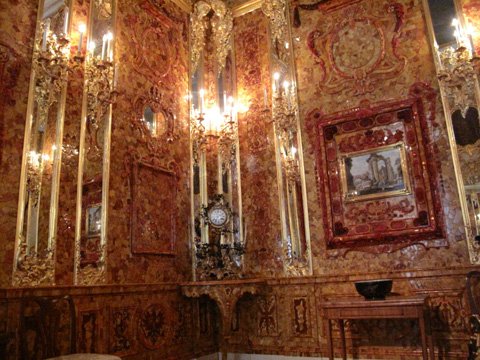 Chiến tranh đă tàn phá những kiệt tác từ hổ phách, th́ nay nước Nga  đă chứng tỏ sự phồn vinh của ḿnh thông qua việc khôi phục lại căn pḥng hổ phách, dát vàng tại các cung điện xa hoa bậc nhất của châu Âu xưa.