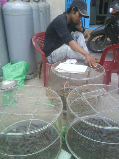 Nhẩm tính gặp được khách VIP, y liền chuyển giọng đon đả: "Anh chị cần bao nhiêu cũng có. Loại nhỏ bằng ngón út em để anh 100 ngàn mỗi con. Lớn th́ tùy loại, hổ hàng 200 ngàn, bông súng, hổ vọ ... 150, rắn nước 180. C̣n hổ mang chúa th́...". Thấy y ngập ngừng, chúng tôi hỏi dồn: "Th́ sao? Có không?". Y cười cười: "Để em liên hệ ông anh xem có không, hàng này hơi khó...". Sau cuộc điện thoại vâng dạ chớp nhoáng, Đen cho biết: "Giờ ảnh nói c̣n 2 con, một hơn 2 kg, con kia 3 kg, 1,7 triệu/1kg , anh chị chịu th́ đợi 2 tiếng nữa ảnh mang hàng tới. Hàng này không bày bán ngoài đường được".