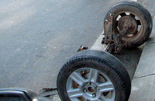 Chiếc taxi đang chạy đến giao lộ Nguyễn Huệ và Điện Biên Phủ (TP Huế) th́ bất giờ phần gầm gắn với trục bị găy làm đôi khiến hai bánh sau rơi ra đường. Sự cố hy hữu này xảy ra vào chiều 7/6, khi tài xế vừa trả khách xong. Cũng may không có thương vong về người, nhưng gây ùn tắc giao thông.