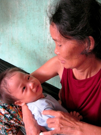 | Bé Trần Thị Yến Châu (19 tháng tuổi) bị bệnh thiểu năng đang được bà Dưỡng chăm sóc. |
