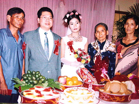 Trần Lập Thánh và Phạm Thị Thanh Trúc (thứ 2 và 3 từ trái sang) trong lễ cưới năm 2003 (Chụp lại từ ảnh tư liệu gia đình).