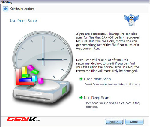 FileWing có hai chế độ hoạt động để bạn sử dụng là Scan Disks để khôi phục tập tin đã xóa và Earse files or drivers để xóa bỏ hoàn toàn các tập tin nhạy cảm. Ở chế độ này bạn sẽ không thể khôi phục lại được các tập tin đã xóa. Bạn hãy lựa chọn chế độ mà mình muốn sử dụng rồi ấn Next.