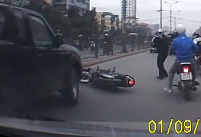 Vụ tai nạn xảy ra trên đường Giải Phóng (Hà Nội) và được một thành viên trên diễn đàn Otofun ghi lại bằng camera hành trình gắn trên xe sáng 9/1. Rất may vụ va chạm không gây thương vong, người đi xe máy đứng dậy được ngay sau đó.
