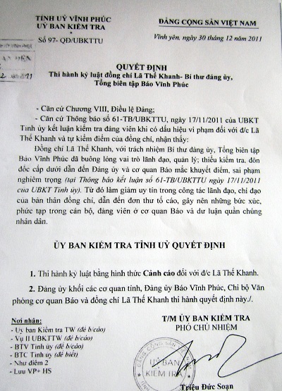 Phó chủ nhiệm Ủy ban Kiểm tra Tỉnh ủy (UBKT) Vĩnh Phúc, ông Triệu Đức Soạn thay mặt UBKT vừa ra quyết định thi hành kỷ luật với h́nh thức cảnh cáo đối với ông Lă Thế Khanh, tổng biên tập Báo Vĩnh Phúc.