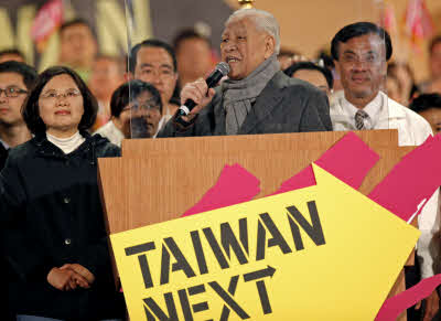 Cựu Tổng Thống Đài Loan Lee Teng-hui, giữa, vận động tranh cử cho ứng cử viên đối lập Tsai Ing-wen, trái. Cuộc bầu cử ở Đài Loan thu hút khách Trung Quốc qua đảo này để xem cái mà họ không có ở nhà: Bầu cử tự do. (H́nh: AP Photo/Vincent Yu)