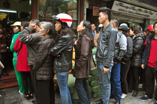 Từ đầu giờ sáng, hàng trăm lượt người dân Hà Nội đã xếp hàng chật cứng trước một cửa hiệu trên đường Hàng Bông để mua bánh chưng về ăn Tết Nguyên Đán đang sắp đến.