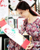 Người đẹp với bức thư pháp mang câu chúc "Phúc sinh phú quý gia đình thịnh".