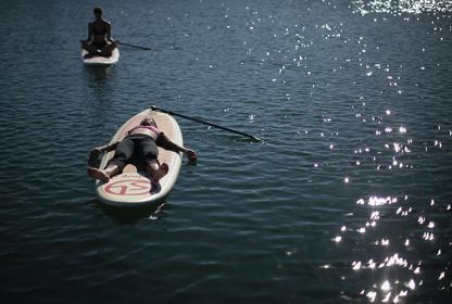 Phụ nữ tập yoga kết hợp với chèo thuyền ở Los Angeles, Mỹ.