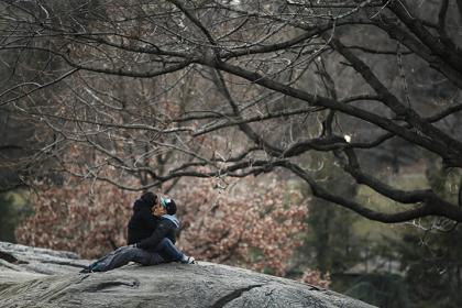 Cặp tình nhân ôm hôn nhau trên một tảng đá lớn trong công viên Trung Tâm ở New York, Mỹ.