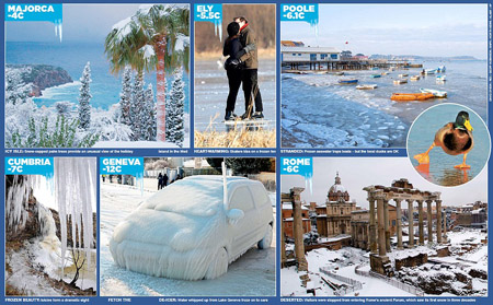 Hệ thống cảnh báo thời tiết ở Siberi ghi nhận được nhiệt độ ở hầu khắp Trung và Đông Âu trung b́nh là -30 độ C, kèm theo tuyết rơi dày. Các con kênh của thành phố Venice, Italia, bắt đầu đóng băng.
