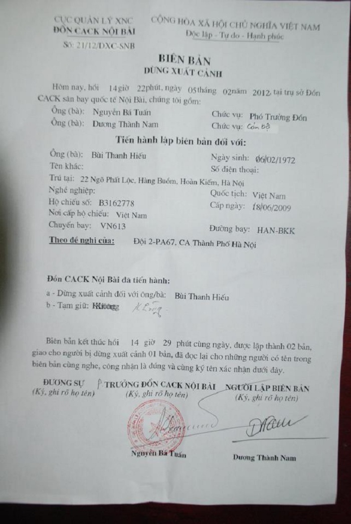 Ông Nguyễn Bá Tuấn, phó trưởng đồn công an cửa khẩu trực tiếp chỉ đạo lập biên bản tại cửa khẩu Nội Bài. Theo biên bản, anh Bùi Thanh Hiếu bị cấm xuất cảnh do đề nghị của Đội 2 – PA67, công an thành phố Hà Nội.