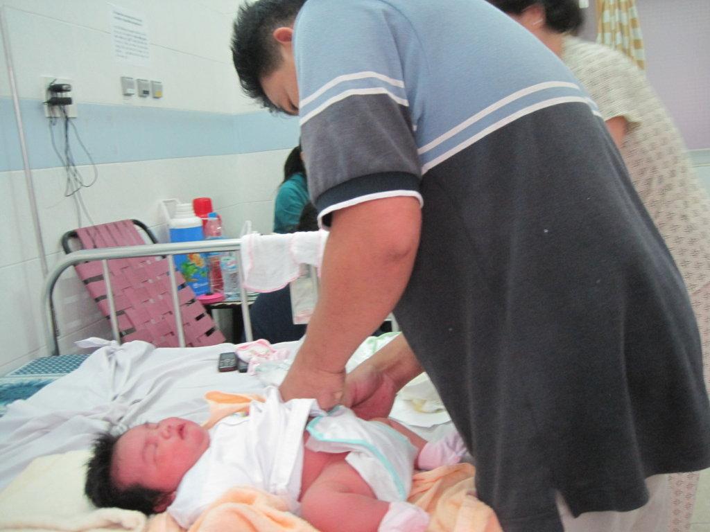 Vừa bế con đi xỏ lỗ tai về, anh Thiện vào phòng đặt con xuống, thay tã xong, anh vui mừng kể lại: "Mấy hôm nay tôi cứ chờ con để được bế nó. Hôm nay thì tha hồ mà bế, vì mấy cô dì có ai bế nổi đâu, nó to con quá mà. Mỗi lần bế sang dãy nhà khoa Nhi khám là tôi đưa đi hết. Bà nội thì yếu, còn cô dì nó cũng sợ bế đi lên cầu thang không an toàn. Con tôi dễ nuôi, nên tôi đỡ lo. Có điều là mua tã cho nó khó quá, thường bị quá khổ nên tã không vừa. Giờ thấy được mẹ con khỏe là tôi vui lắm rồi".