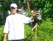 Đầu bếp Văn với khu vườn rau Việt Nam tại Mauritius. Ảnh: Phan Anh