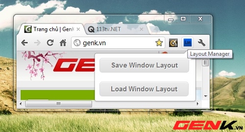 Khi bạn làm việc với nhiều cửa sổ trong Chrome, nếu muốn lưu lại vị trí và các URL đang mở, bạn chỉ cần nhấn vào biểu tượng của tiện ích Layout Manager. Một cửa sổ pop-up sẽ xuất hiện phía dưới với 2 lựa chọn là Save Windows Layout (lưu lại vị trí và các tabs đang mở) và Load Windows Layout (khôi phục vị trí và các tab đã lưu trữ trước đó).