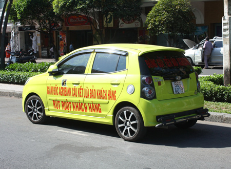 Sáng 5/3, hàng trăm người dân đă tụ tập đến xem chiếc xe hơi biển kiểm soát 56S – 4079 đậu trên đường Nguyễn Huệ, Q.1, TP HCM ghi hai bên hông xe và sau xe “tố” giám đốc ngân hàng Agribank cấu kết lừa đảo, rút ruột khách hàng.