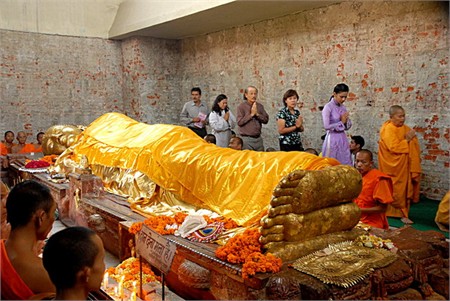 Các Phật tử thành tâm trước tượng tài Đức Phật Thích Ca nhập niết bàn ở Ấn Độ