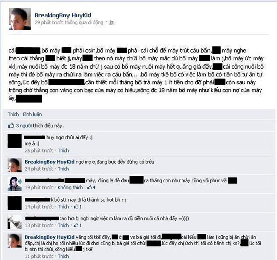 Nửa đêm qua, internet Việt nhanh chóng lan tràn ảnh chụp màn hình của một teen boy đăng tải dòng status (tâm trạng) với những lời lẽ không thể chấp nhận được về mẹ của mình.
