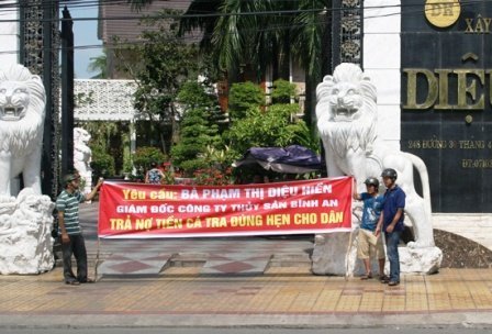 Nông dân trưng băng rôn đòi nợ trước nhà của bà Diệu Hiền.