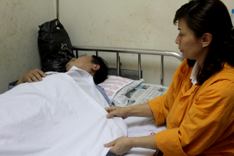 Bà Hiền chăm sóc chồng ở bệnh viện 19-8. Ảnh: Việt Dũng.