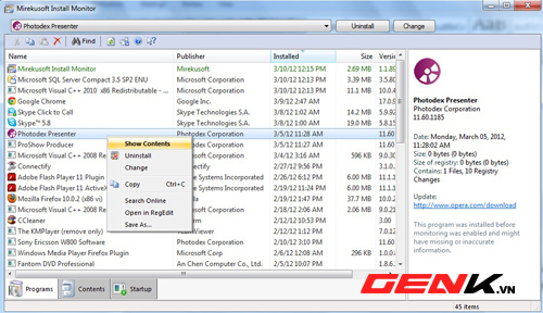 Khi mở ứng dụng Install Monitor lên bạn sẽ thấy giao diện của ứng dụng liệt kê tất cả các phần mềm đã được cài đặt trên hệ thống. Bạn hãy bấm chuột phải vào một trong những ứng dụng được liệt kê, một menu sẽ xuất hiện với một vài tùy chọn cho bạn như xem nội dung các khóa registry của ứng dụng đó hay gở bõ ứng dụng.