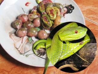 Từ óc động vật, người ta chuyển sang ăn bào thai động vật hoang dã theo cái nghĩa càng quý càng hiếm như thỏ, hươu, nai, lợn rừng, gấu… Trong đó rắn lục sắp đến kỳ “khai hoa nở nhụy” là “đẳng cấp” số 1. “Đao phủ” bằng cái vẩy tay trái nhanh như chớp mắt tóm gọn đầu con rắn lục, tay phải dùng dao nhọn phạt đứt đuôi con rắn, dòng máu đỏ được “chắt” vào từng ly rượu. Thêm một lần đưa dao, bộ lòng tung ra, trái tim con rắn được tách ra, thoi thóp đập trên đĩa, túi mật xanh lét được đánh giá là tinh túy nhất của con rắn được lấy ra cho vào một cốc rượu to. Nhát dao thứ ba xiên thẳng vào bào thai con rắn mẹ, những con rắn lục con chưa đủ tháng ngày nằm chiễm chệ trên đĩa, quằn quại. Ly rượu màu đỏ, ly rượu màu xanh được các đại gia khai màn, trái tim rắn được thả vào ly rượu khác rất nhanh trôi tuột vào bụng thực khách. Tiếp sau, các con rắn lục con nằm gọn trên từng đôi đũa, thực khách nhúng qua nồi nước dùng sôi sùng sục… và thế được gọi là bổ dương?!!