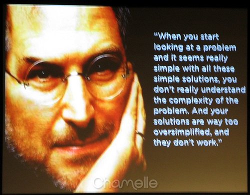 Jobs quan tâm đến sự đơn giản bắt nguồn từ tâm lư muốn chinh phục, chứ không phải bỏ qua, sự phức tạp. Khi đă đạt đến mức độ đơn giản như ông mong muốn, sản phẩm tạo ra sẽ vô cùng thân thiện với người dùng chứ không phải đánh đố họ. Ông nói: “Mọi chuyện thực ra hoàn toàn không dễ dàng. Để sản xuất được một cái ǵ đơn giản, cần phải hiểu được thách thức và t́m ra giải pháp.”