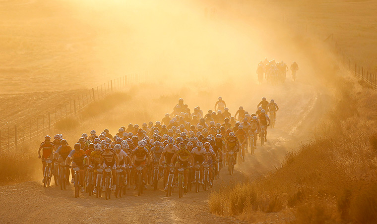 Các vận động viên đua xe đạp leo núi đi qua vùng ngoại ô trong nắng sớm ở Overberg, Nam Phi.