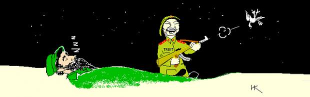 Tuyên bố như trên cho cả bà con thiên hạ biết, rò ràng là anh Cu đã bỏ gác. Trong thế trận một mất một còn, bỏ gác là chết, đồng chí Cu làm chú Triết và đảng bay chưng hửng, phải gồng mình bỏ giường bỏ chiếu nhảy dậy đi gác dùm anh Cu không thì con chim hoà bình bị bọn Đế quốc hiếu chiến thộp cổ vặt lông ngay tức thì.