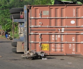 Lúc 20 giờ 30 tối 22.4, trên đường ĐT 741, đoạn qua địa xã Bù Nho, H.Bù Gia Mập (Bình Phước) xảy ra vụ tai nạn lật xe container, làm chết hai cha con đi xe máy.