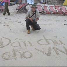 Blogger Điếu Cày và ḍng chữ "Dân chủ cho Việt Nam" viết trên cát