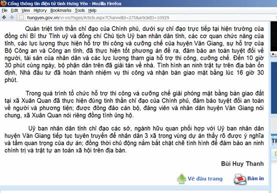 “Quán triệt tinh thần chỉ đạo của Chính phủ, dưới sự chỉ đạo trực tiếp tại hiện trường của đồng chí Bí thư Tỉnh ủy và đồng chí Chủ tịch Ủy ban nhân dân tỉnh, các cơ quan chức năng của tỉnh, các lực lượng thực hiện hỗ trợ thi công và cưỡng chế của huyện Văn Giang, sự hỗ trợ của Bộ Công an và Công an tỉnh, đă thực hiện tốt phương án đề ra, đảm bảo an toàn tuyệt đối về người, tài sản của nhân dân và các lực lượng tham gia hỗ trợ thi công, cưỡng chế. Đến 10 giờ 30 phút cùng ngày, bộ phận dân trên đă giải tán về nhà. T́nh h́nh an ninh trật tự trên địa bàn ổn định, Nhà đầu tư đă hoàn thành nhiệm vụ thi công và nhận bàn giao mặt bằng lúc 16 giờ 30 phút.