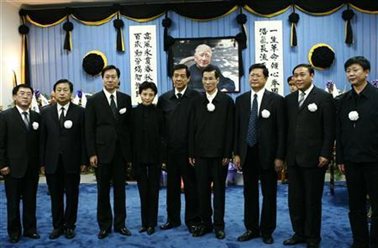 Cốc Khai Lai (thứ 4 từ trái sang) và chồng Bạc Hy Lai (thứ 5 từ trái sang) tại lễ tang của bố chồng - Bạc Nhất Ba. Ảnh Reuters