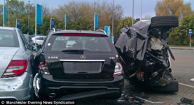 Chiếc xe “Mẹc” đầu tiên trong vụ vạ chạm đã thiệt hại khoảng 40 ngàn bảng Anh. Và hiệu ứng Dominotiếp tục tạo nên những tổn thất lớn khi 4 chiếc xe sang trọng của hãng xe danh tiếng nước Đức đỗ liền kề cũng lần lượt bị biến dạng.