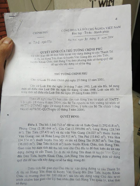 Khoan hãy nói đến tính hợp pháp của văn bản trên mà chỉ đề cập đến những vấn đề đang được báo lề Dân đưa tin, cho rằng : con gái của Thủ tướng có cổ phần trong dự án đó lên mới được ký duyệt đơn giản, nhanh chóng như vậy. Chuyện một phó thủ tướng có được phép ký quyết định giao cả nửa ngàn ( 500) hécta đất nông nghiệp màu mỡ đang có giá trị cao hàng đầu ở Miền bắc, cho một công ty tư nhân làm dự án kinh doanh thương mại là đúng hay sai luật thì hãy để mấy anh bên Bộ tư pháp nghiên cứu và trả lời trên công luận. Chỉ thấy rằng : dân huyện Văn Giang mất đi từng ấy đất nông nghiệp mà họ đang làm ăn sinh sống trên đó rồi họ sẽ ra sao - đó là câu hỏi cần giải đáp.