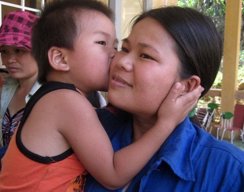 Cháu được chụp ảnh thì thích quá, nhất định không chịu rời mẹ, cứ muốn chụp mãi, chụp mãi, mắt tít lại vì cười. Gần đó, anh Bàn Văn Thạch đang nhễ nhại mồ hôi bế vỗ về cô con gái 5 tuổi. Anh Thạch cười không dứt, nhưng khi bảo anh “thơm” con để chụp hình, thì anh cứ lóng ngóng mãi. “Xấu hổ lắm” – anh cười từ chối, nhưng rồi cũng “cố gắng” đặt nhẹ lên má con một nụ hôn. Cô bé nũng nịu vùi mặt vào ngực bố.