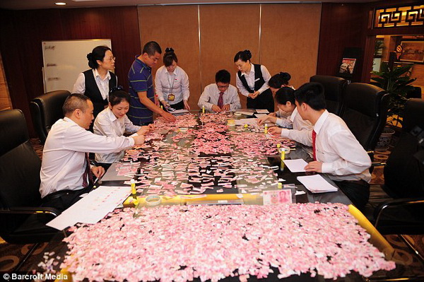 Nhân viên ngân hàng Trung Quốc toát mồ hôi ghép đống tiền rách