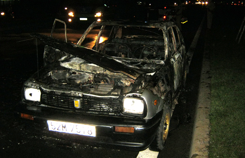 Trong ảnh: lúc 18g40 ngày 15-5, một ôtô hiệu Honda Civic biển số TP.HCM bỗng nhiên bốc cháy ngùn ngụt tại đoạn giao nhau giữa đại lộ Võ Văn Kiệt và đường 2F (P.An Lạc, Q.Bình Tân, TP.HCM). Ông Trần Đề (61 tuổi, ngụ tại P.7, Q.8, TP.HCM) - người lái ôtô - cho biết khi đến địa điểm trên, bất ngờ ông cảm thấy mắt cay xè nên nghi ngờ, thắng xe lại mở nắp capô ra kiểm tra thì thấy ống dẫn vào bình xăng bốc cháy. Dập mãi không tắt nên ông đành bỏ chạy gọi điện báo cho lực lượng cảnh sát PCCC nhưng không kịp, chiếc xe đã bốc cháy dữ dội.