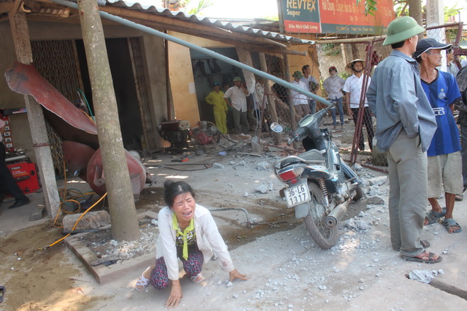 Lúc 9g sáng nay, khi phóng viên TTO có mặt tại hiện trường thì thấy bình hơi và một số thiết bị vá lốp ôtô trong tiệm sửa xe của ông Hát vỡ nát, một số cột bê tông gãy đổ.