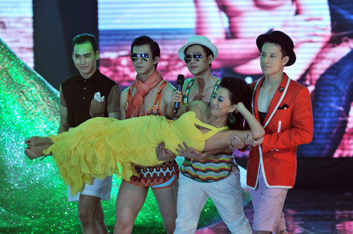 MC Kỳ Duyên cười rạng rỡ khi được mẫu nam bế trên sân khấu