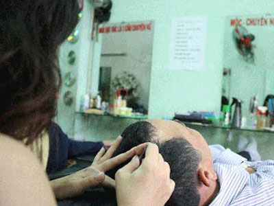 Hơn 9 giờ, tôi ghé qua một tiệm trên đường Bà Hạt, phường 4, quận 10 - TPHCM để nhờ giải quyết mấy sợi tóc bạc. Lúc này, tiệm đă có khách. Mọi người thả ḿnh trên ghế, lim dim; cô nhân viên khẽ khàng vén tóc khách nhổ từng sợi bạc và massage nhè nhẹ. Cảm giác khoan khoái đến tuyệt vời!