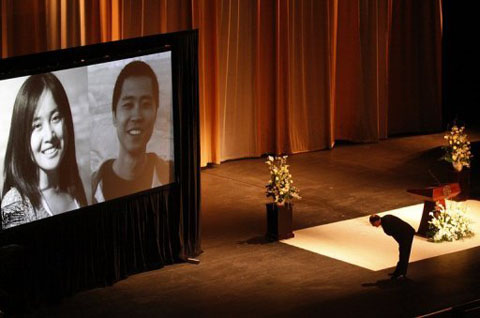 Hiệu trưởng trường đại học Nam California trong lễ tưởng niệm hai sinh viên xấu số của trường. Ảnh: AFP