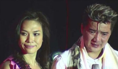Mỹ Tâm bên cạnh Đàm Vĩnh Hưng với khuôn mặt bàng hoàng sau khi bị tấn công. Ảnh: MercuryNews.