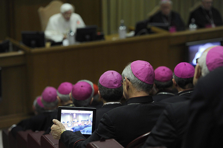 Một giám mục dùng iPad để ghi hình bài phát biểu của giáo hoàng Pope Benedict XVI trong hội trường Synod ở thành phố Vatican, Rome, Italia.