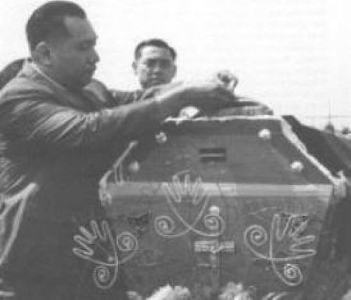 Bộ trưởng Bộ Giáo dục VNCH Tăng Kim Đông gắn huân chương lên quan tài của bốn bác sĩ người Đức bị giết chết ở Huế trong thời