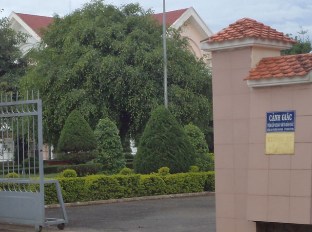 Cổng trụ sở Thành ủy Pleiku bên trái là bảng tên cơ quan với dòng chữ nền đỏ, còn bên phải là cái bảng màu xanh in dòng chữ: "Cảnh giác - trộm cắp xe máy và tài sản khác”