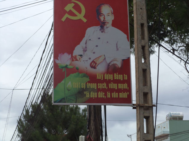 Tấm áp phích vẽ hình Bác Hồ và dòng chữ: "Xây dựng Đảng ta thật sự trong sạch, vững mạnh “là đạo đức, là văn minh". Việc xây dựng Đảng trong sạch chỉ là đạo đức văn minh thôi, chứ đâu phải là sự tồn vong sống còn của Đảng, của chế độ, vậy mà ông tổng Trọng vội vã cho là “nguy cơ” và triệu tập hội nghị trung ương ra nghị quyết 4.