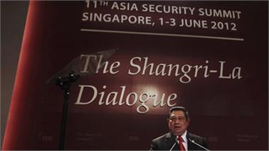 Gần 300 quan chức và chuyên gia an ninh từ 27 quốc gia hầu hết tại châu Á đă tham dự Hội nghị Thượng đỉnh An ninh châu Á lần thứ 11 - c̣n gọi là Đối thoại Shangri-la 11 tại Singapore hôm qua. Tuy nhiên, Bộ trưởng Quốc pḥng Trung Quốc đă không tới dự. Trong ảnh là Tổng thống Indonesia phát biểu tại phiên khai mạc.